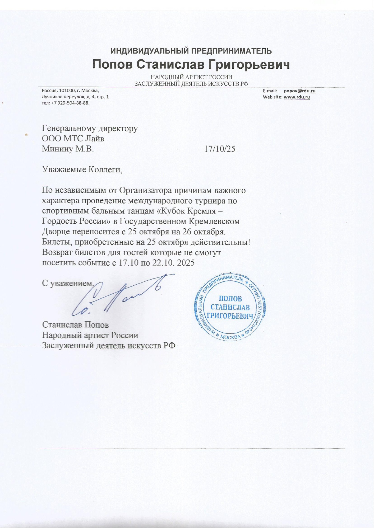 Уважаемый клиент! Спешим сообщить, что по информации, полученной от организатора, мероприятие «Кубок Кремля — Гордость России!», запланированное на 25 октября 2025 года в 17:00 в Кремле, перенесено на 26 октября 2025 года, начало в 17:00. Ранее приобретенные билеты действительны, обменивать их не нужно. Если новая дата вам не подходит, вы можете вернуть билет по кнопке в личном кабинете во вкладке «Заказы» (до 22.10.25, включительно). Деньги за электронные билеты вернутся автоматически в полном объёме на карту, с которой была произведена оплата. Если вы купили билет в кассе Ticketland.ru за наличный расчет, то обратитесь, пожалуйста, на почту: vozvrat@ticketland.ru. С уважением, команда поддержки Ticketland.