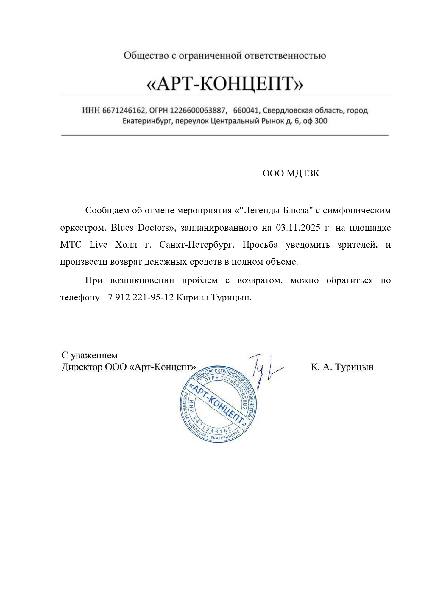 Уважаемый клиент! Спешим сообщить, что по информации, полученной от организатора, концерт «Blues Doctors c симфоническим оркестром. Легенды блюза», запланированный на 3 ноября 2025 года в МТС Live Холле (Санкт-Петербург), отменен. Деньги за электронные билеты вернутся автоматически в полном объёме на карту, с которой была произведена оплата. Если вы купили билет в кассе Ticketland.ru за наличный расчет, то обратитесь, пожалуйста, на почту: vozvrat@ticketland.ru. С уважением, команда поддержки Ticketland