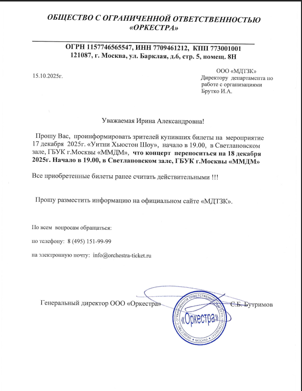 Уважаемый клиент! Спешим сообщить, что по информации, полученной от организатора, Уитни Хьюстон Шоу, запланированное на 17 декабря 2025г. в 19.00 в Доме музыки, переносится на 18 декабря 2025г. в 19.00. Ранее приобретенные билеты действительны на новую дату. По всем вопросам обращаться:по телефону: 8 (495) 151-99-99; на электронную почту: info@orchestra-ticket.ru С уважением, команда поддержки Ticketland.