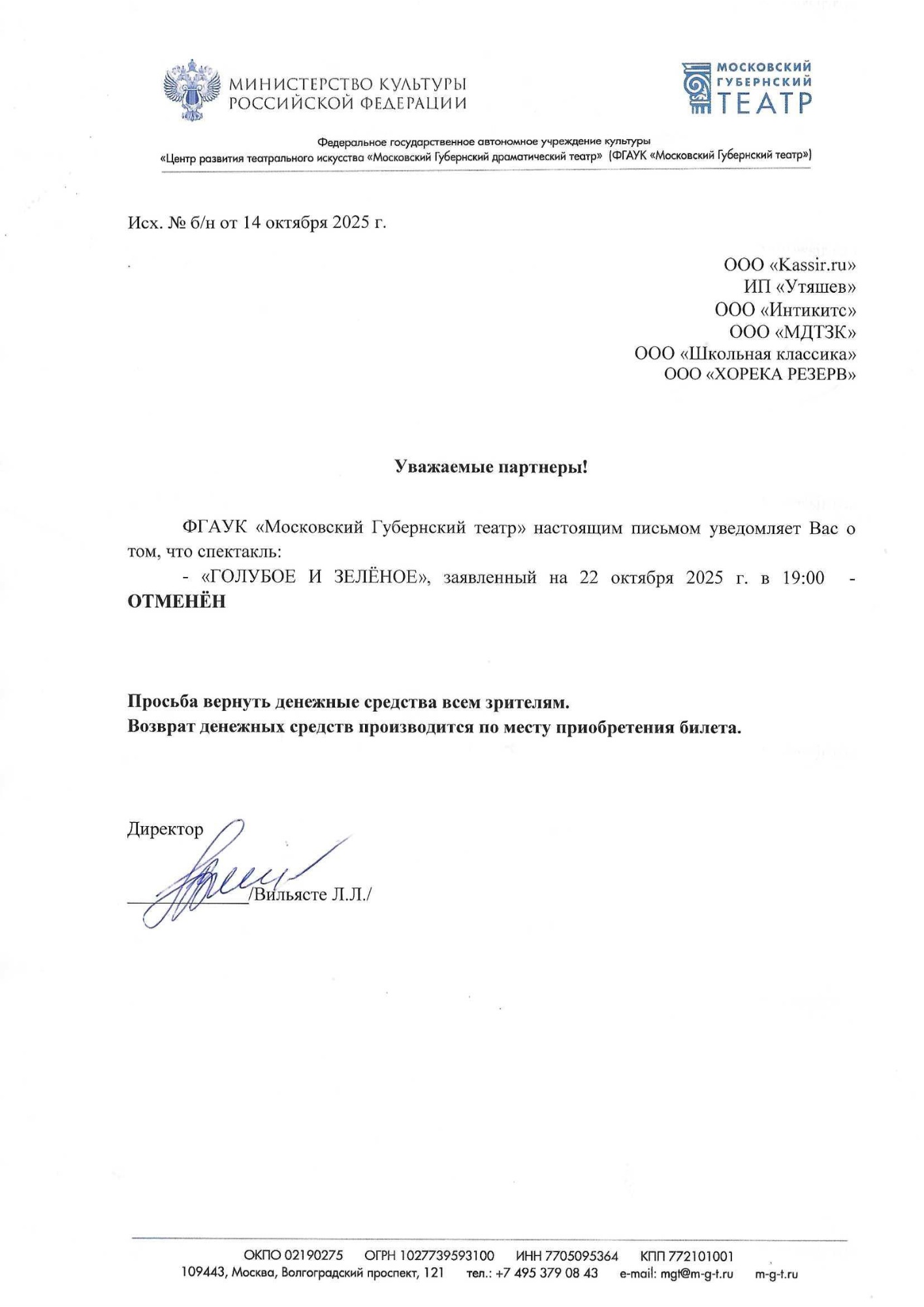 Уважаемый клиент! Спешим сообщить, что по информации, полученной от организатора, спектакль «Голубое и зеленое», запланированный на 22 октября 2025 года в Губернском театре, отменен. Деньги за электронные билеты вернутся автоматически в полном объёме на карту, с которой была произведена оплата. Если вы купили билет в кассе Ticketland.ru за наличный расчет, то обратитесь, пожалуйста, на почту: vozvrat@ticketland.ru. С уважением, команда поддержки Ticketland