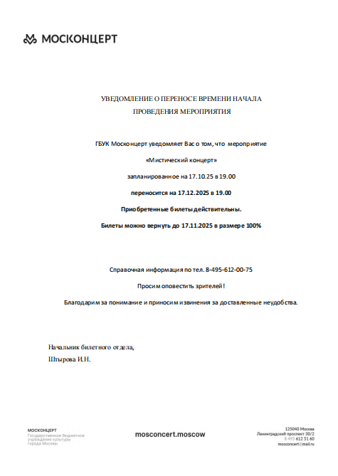 Уважаемый клиент! Спешим сообщить, что по информации, полученной от организатора, Мистический концерт, запланированный на 17.10.25 в 19.00 в Музыкальной квартире на Тверской, переносится на17.12.2025 в 19.00. Ранее приобретенные билеты действительны на новое мероприятие, обменивать их не нужно. Если новое мероприятие вам не подходит, вы можете вернуть билет по кнопке в личном кабинете во вкладке «Заказы» (до 17.11.2025). Деньги за электронные билеты вернутся автоматически в полном объёме на карту, с которой была произведена оплата. Если вы купили билет в кассе Ticketland.ru за наличный расчет, то обратитесь, пожалуйста, на почту: vozvrat@ticketland.ru. С уважением, команда поддержки Ticketland.