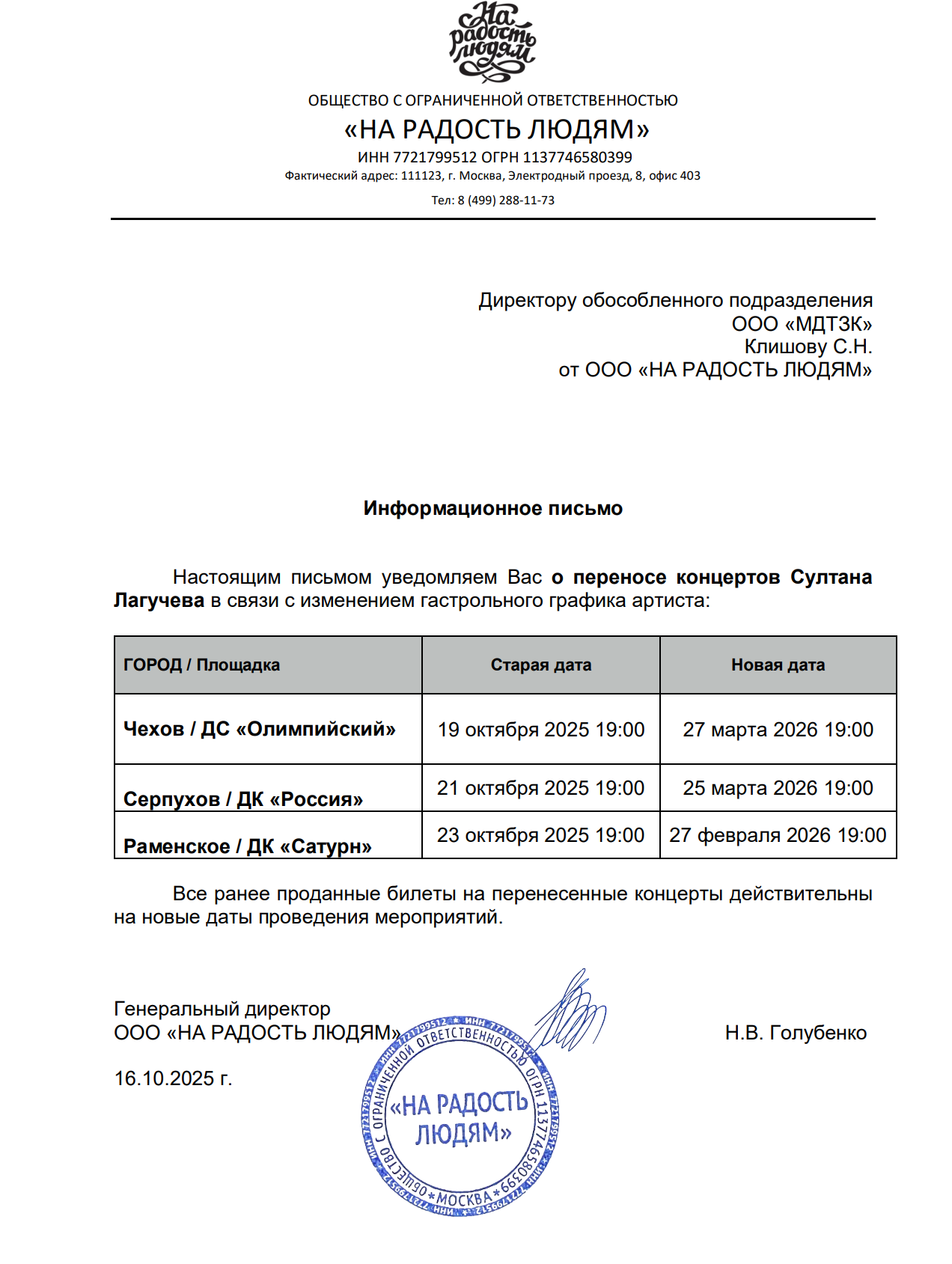 Уважаемый клиент! Спешим сообщить, что по информации, полученной от организатора, концерт Султана Лагучева, запланированный на 21 октября 2025 года в 19:00 в ДК Россия, перенесен на 25 марта 2026 года в 19:00. Ранее приобретенные билеты действительны на новое мероприятие, обменивать их не нужно. Если новое мероприятие вам не подходит, вы можете вернуть билет по кнопке в личном кабинете во вкладке «Заказы». Деньги за электронные билеты вернутся автоматически в полном объёме на карту, с которой была произведена оплата. Если вы купили билет в кассе Ticketland.ru за наличный расчет, то обратитесь, пожалуйста, на почту: vozvrat@ticketland.ru. С уважением, команда поддержки Ticketland.