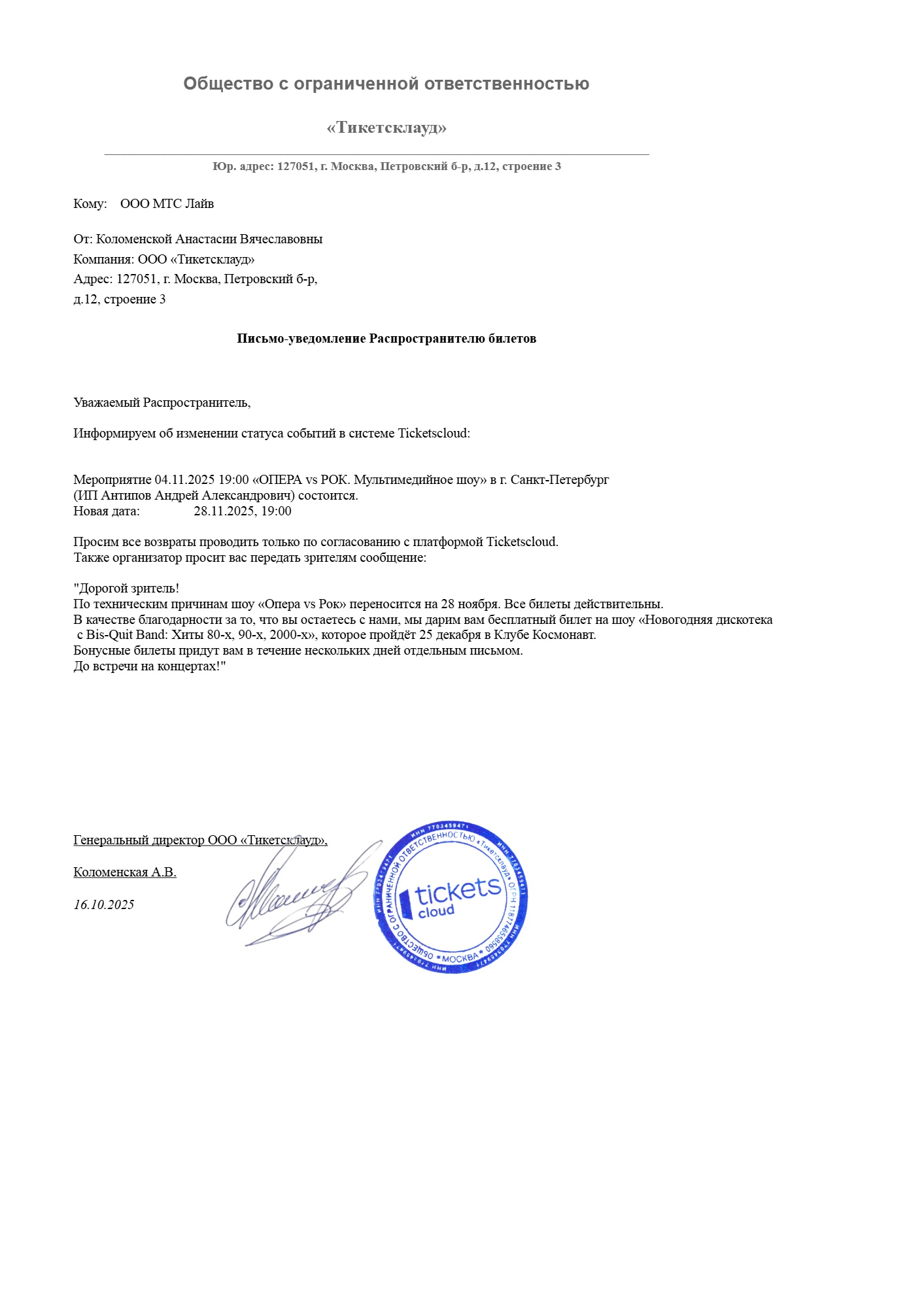 Уважаемый клиент! Спешим сообщить, что по информации, полученной от организатора, мультимедийное шоу «Опера vs Рок», запланированное на 4 ноября 2025 года в 19:00 в МТС Live Холле Санкт-Петербург, перенесено на 28 ноября 2025 года, начало в 19:00. Ранее приобретенные билеты действительны, обменивать их не нужно. Условия возврата будут объявлены дополнительно. С уважением, команда поддержки Ticketland.