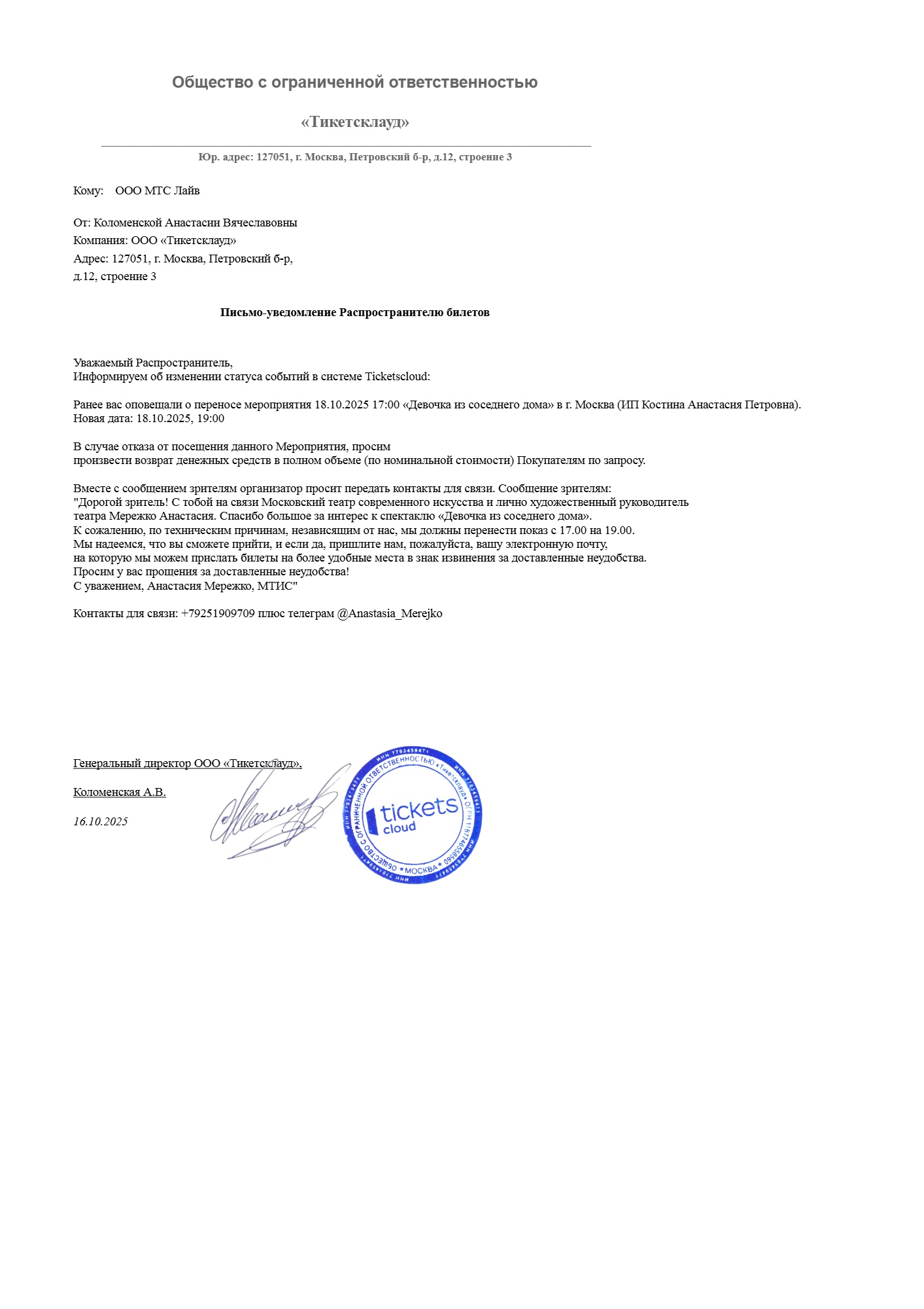 Уважаемый клиент! Спешим сообщить, что по информации, полученной от организатора, спектакль «Девочка из соседнего дома», запланированный на 18 октября 2025 года в 17:00 в центре новой культуры «Мир искусств», перенесен на 19:00. Ранее приобретенные билеты действительны, обменивать их не нужно. Если новое время вам не подходит, вы можете вернуть билет по кнопке в личном кабинете во вкладке «Заказы» (до 18.10.25 19:00). Деньги за электронные билеты вернутся автоматически в полном объёме на карту, с которой была произведена оплата. Если вы купили билет в кассе Ticketland.ru за наличный расчет, то обратитесь, пожалуйста, на почту: vozvrat@ticketland.ru. С уважением, команда поддержки Ticketland.