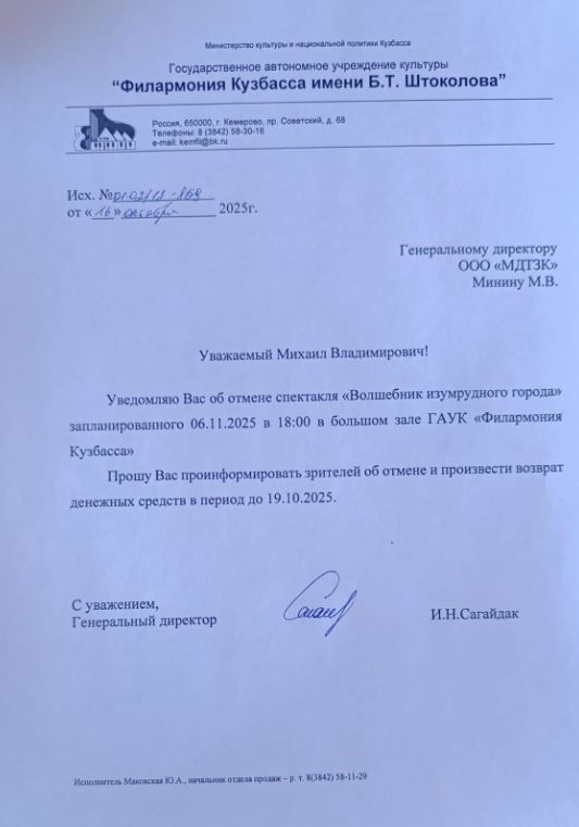 Уважаемый клиент! Спешим сообщить, что по информации, полученной от организатора, спектакль «Волшебник Изумрудного города», запланированный на 6 ноября 2025 года в филармонии Кузбасса им. Штоколова, отменен. Деньги за электронные билеты вернутся автоматически в полном объёме на карту, с которой была произведена оплата. Если вы купили билет в кассе Ticketland.ru за наличный расчет, то обратитесь, пожалуйста, на почту: vozvrat@ticketland.ru. С уважением, команда поддержки Ticketland