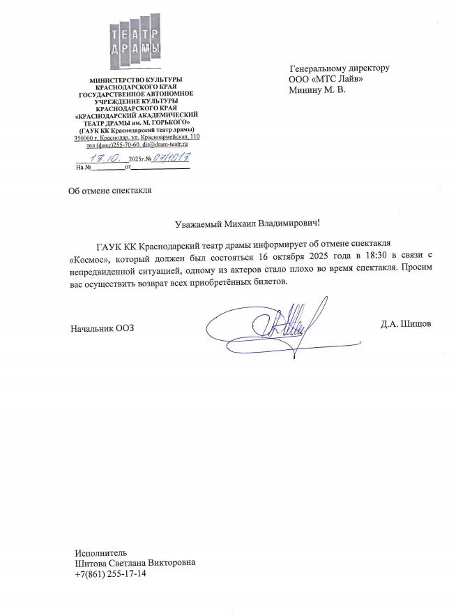 Уважаемый клиент! Спешим сообщить, что по информации, полученной от организатора, спектакль «Космос», запланированный на 16 октября 2025 года в Краснодарском театре драмы, отменен. Деньги за электронные билеты вернутся автоматически в полном объёме на карту, с которой была произведена оплата. Если вы купили билет в кассе Ticketland.ru за наличный расчет, то обратитесь, пожалуйста, на почту: vozvrat@ticketland.ru. С уважением, команда поддержки Ticketland