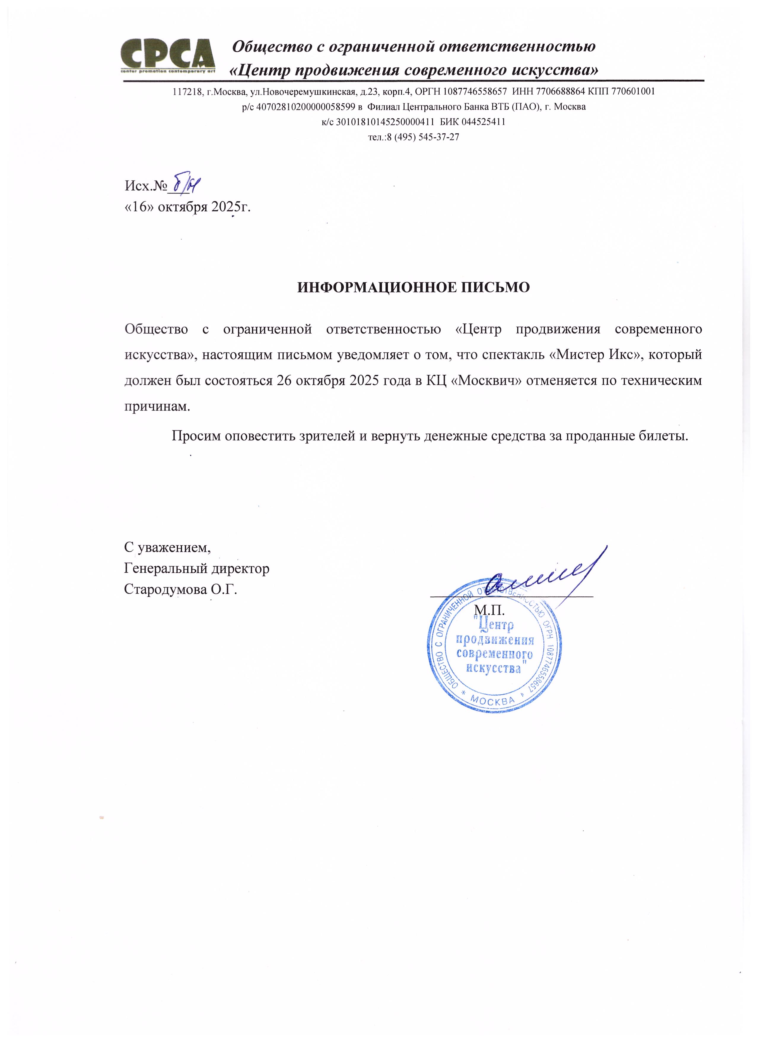 Уважаемый клиент! Спешим сообщить, что по информации, полученной от организатора, оперетта «Мистер Икс», запланированная на 26 октября 2025 года КЦ «Москвич», отменена. Деньги за электронные билеты вернутся автоматически в полном объёме на карту, с которой была произведена оплата. Если вы купили билет в кассе Ticketland.ru за наличный расчет, то обратитесь, пожалуйста, на почту: vozvrat@ticketland.ru. С уважением, команда поддержки Ticketland