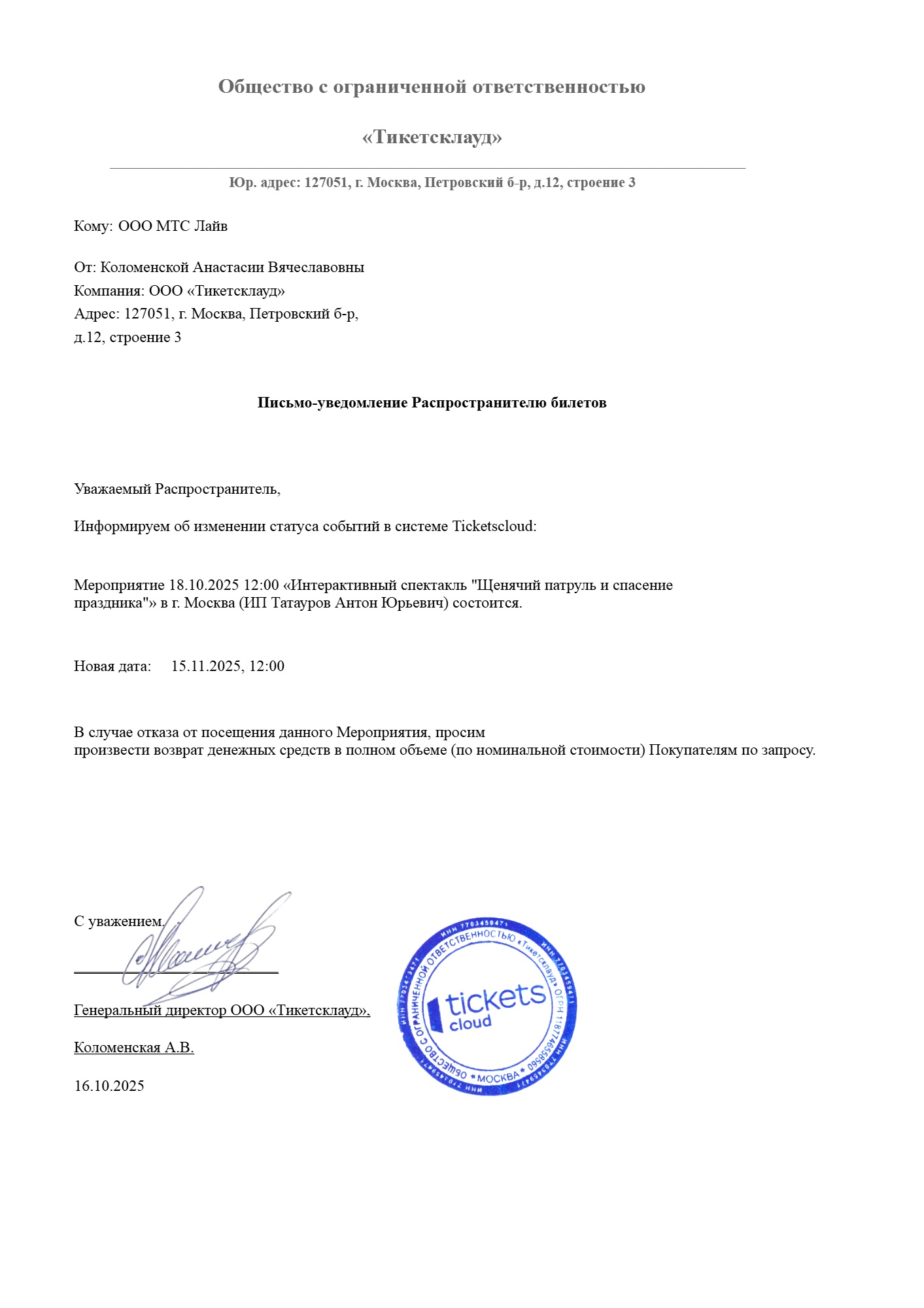 Уважаемый клиент! Спешим сообщить, что по информации, полученной от организатора, интерактивный спектакль «Щенячий патруль и спасение праздника», запланированный на 18 октября 2025 года в 12:00 в Библиотеке 159, перенесён на 15 ноября 2025 года, начало в 12:00. Ранее приобретенные билеты действительны на новую дату, обменивать их не нужно. Если вам не удобно посетить спектакль в новую дату, вы можете вернуть билет по кнопке в личном кабинете во вкладке «Заказы» (до 15.11.25 12:00). Деньги за электронные билеты вернутся автоматически в полном объёме на карту, с которой была произведена оплата. Если вы купили билет в кассе Ticketland.ru за наличный расчет, то обратитесь, пожалуйста, на почту: vozvrat@ticketland.ru. С уважением, команда поддержки Ticketland.